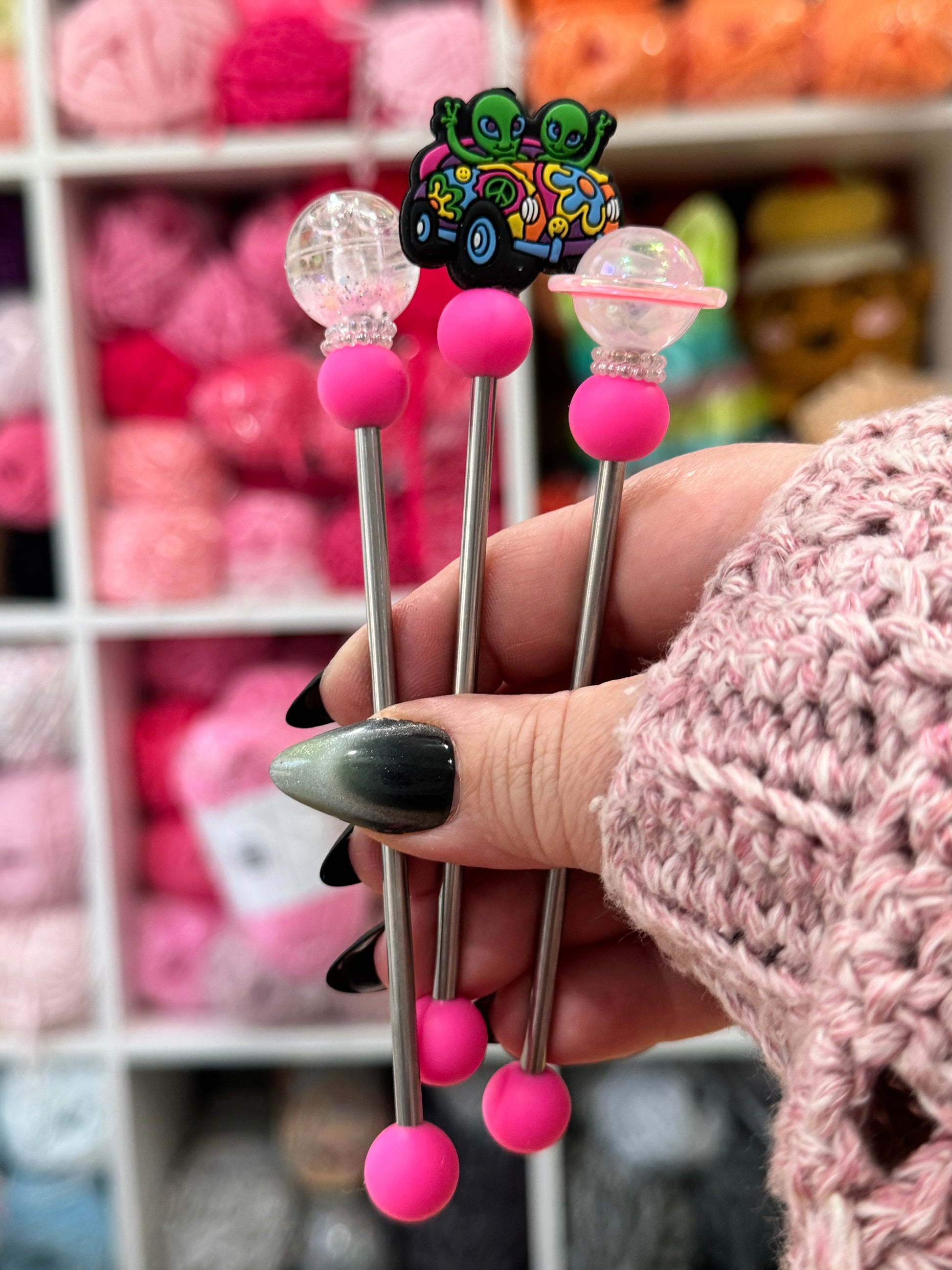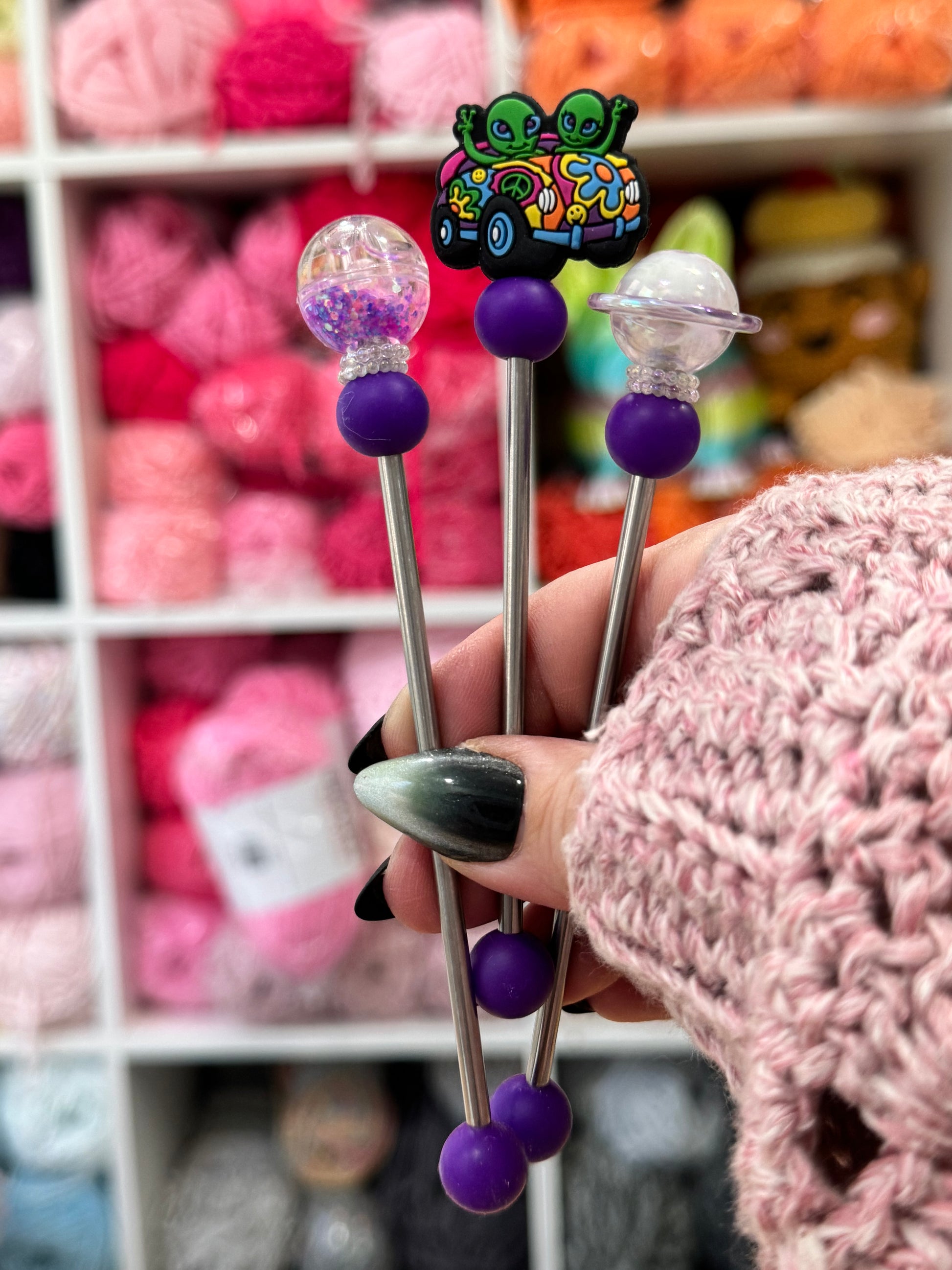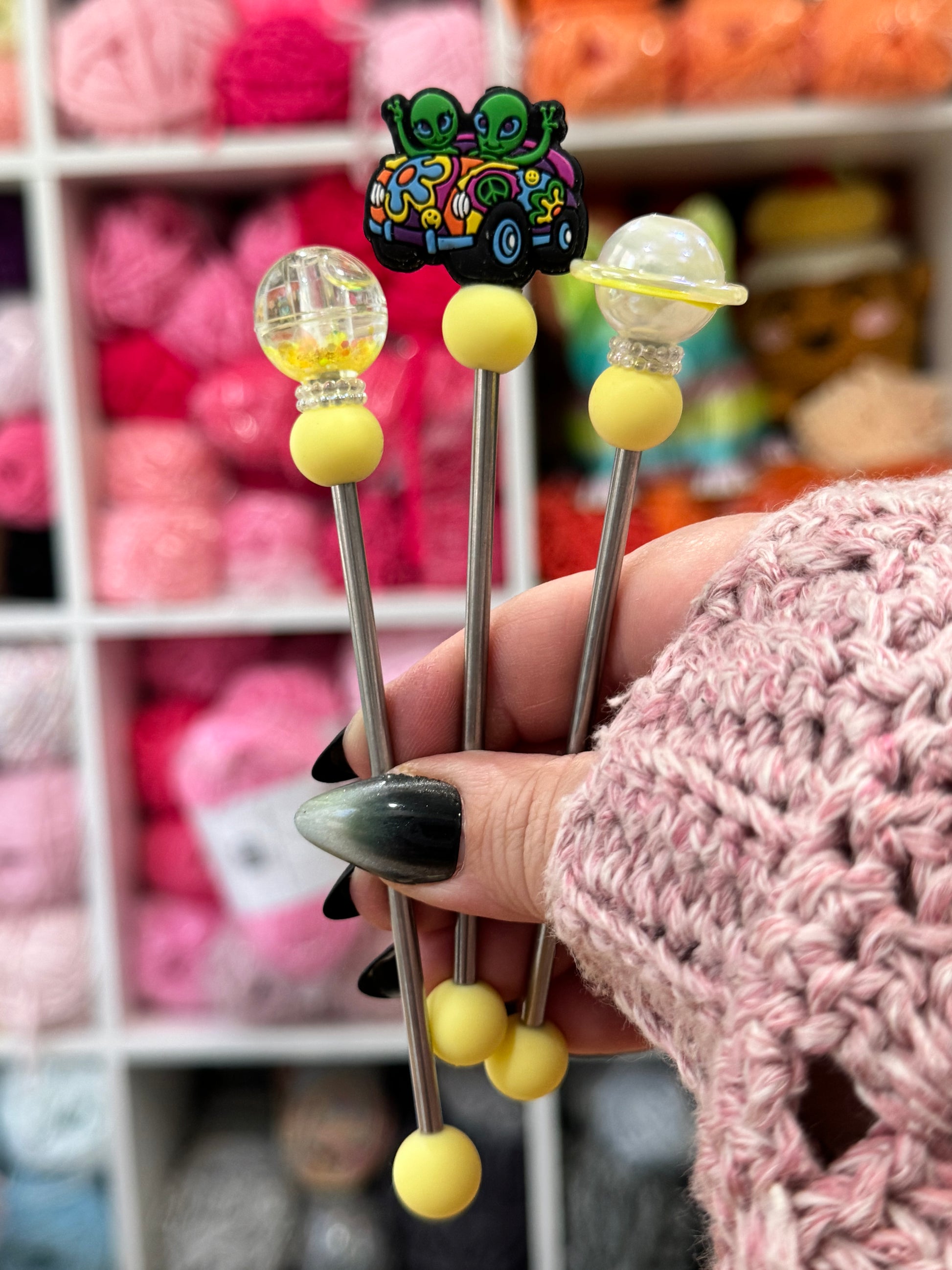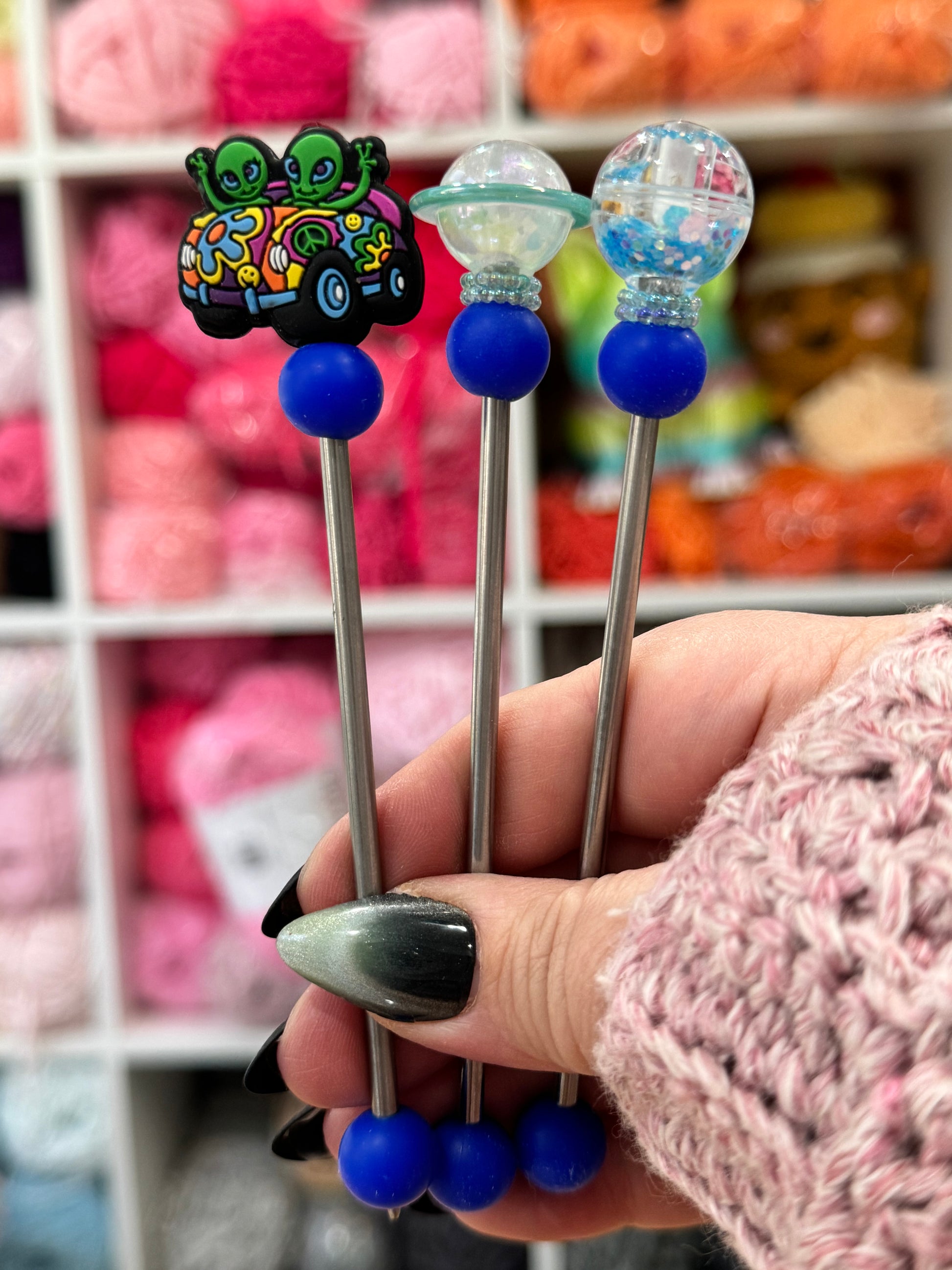 This AmiStix™️ Minis set can be purchased trio. The beads used vary with each one made and some may glow in the dark. Your glow in the dark beads or solid color beads may not match the picture exactly and we do that on purpose to keep your set unique. AmiStix™️ Minis help hold your projects together while you sew them closed. They are 5 inches long with about 4 inches of working space. Each Stix comes with a reusable bag and safety tip.