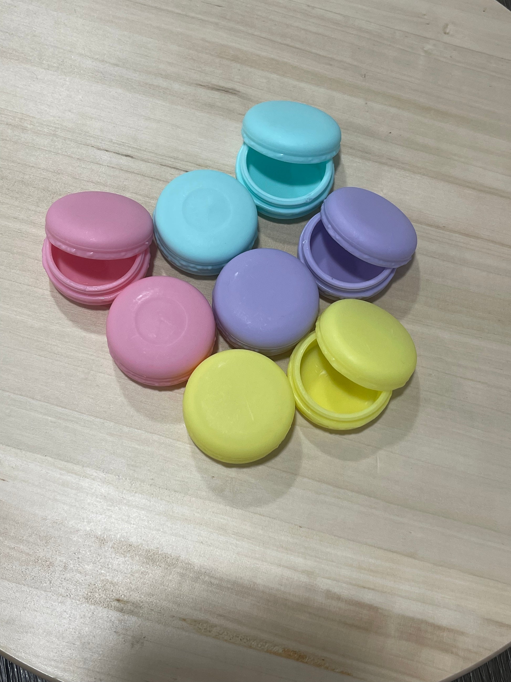 Container opens to hold odd and ends. Uses could be stitch markers, safety eyes, felt eyes, thread, ect. Includes 4 colors, pink, lavender, yellow, mint