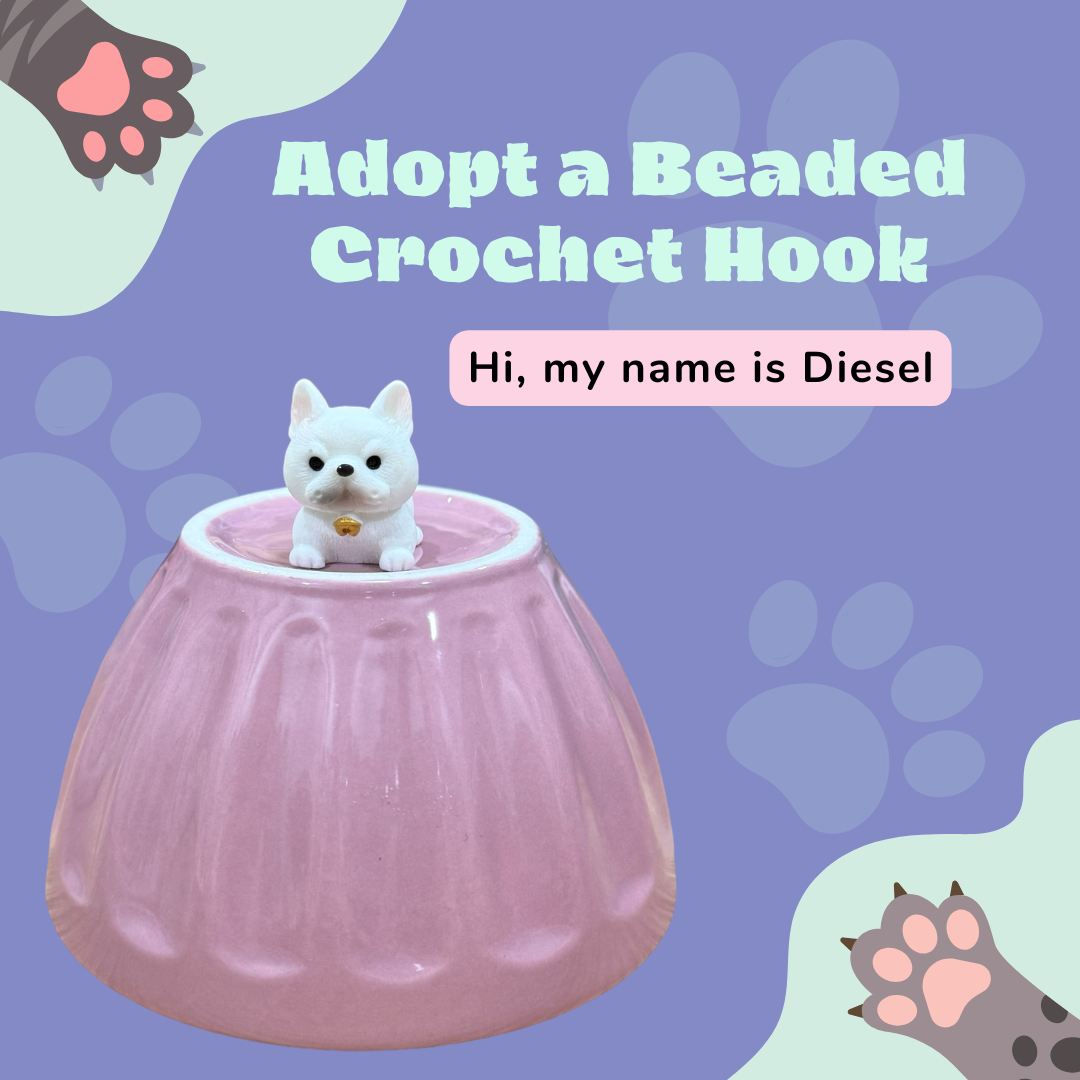 You are adopting a beaded crochet hook. We will coordinate the beads on your hook with what suits your adopted pet best. The beads used vary with each one made and some may glow in the dark or are printed. Printed beads and glitter beads fade over time with wear. Metals used on hook may tarnish.