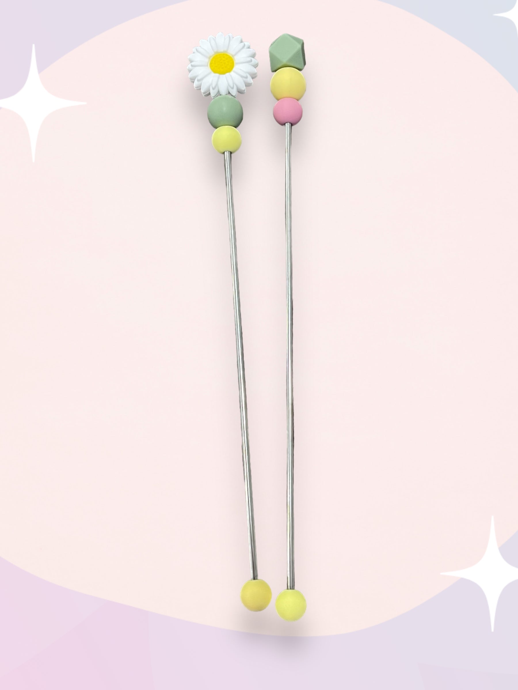 Ami Stitch Stix help hold your projects together while you sew them closed. They are 9 inches long with about 7 - 8 inches of working space. Each Stix comes with a reusable bag and two Ami Stitch Stix. The images are a sample of your Ami Stitch Stix design. We keep the the sets as close to the colors pictured however the beads used vary with each one made and some may glow in the dark. Your glow in the dark beads or solid color beads may not match the picture exactly and we do that on purpose to keep your set unique. Please be aware the printed beads fade over time.
