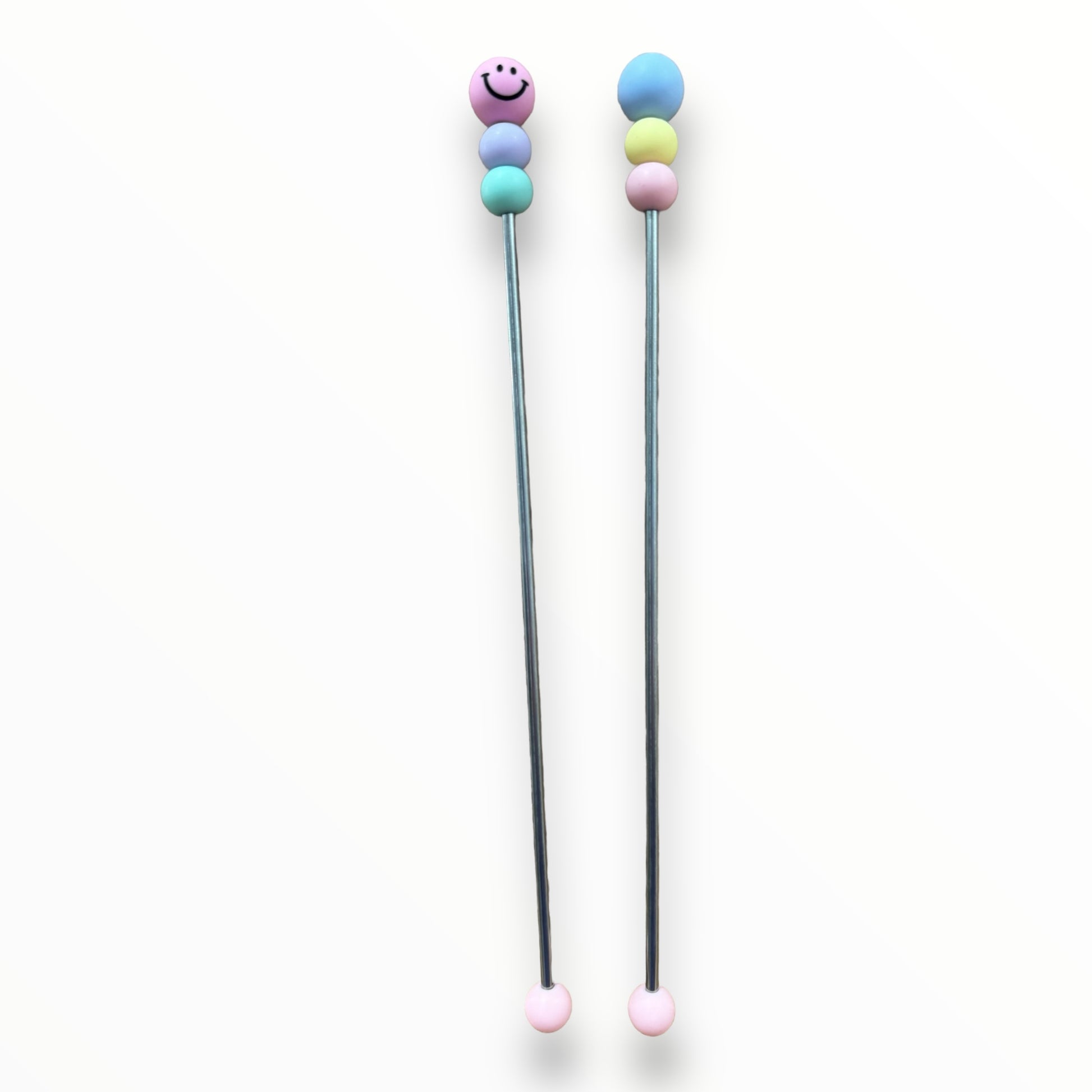 Each set comes with two stix, one with a focal and one beaded. They are 9 inches long with about 7 - 8 inches of working space. Each Stix comes with a reusable bag and safety tip.