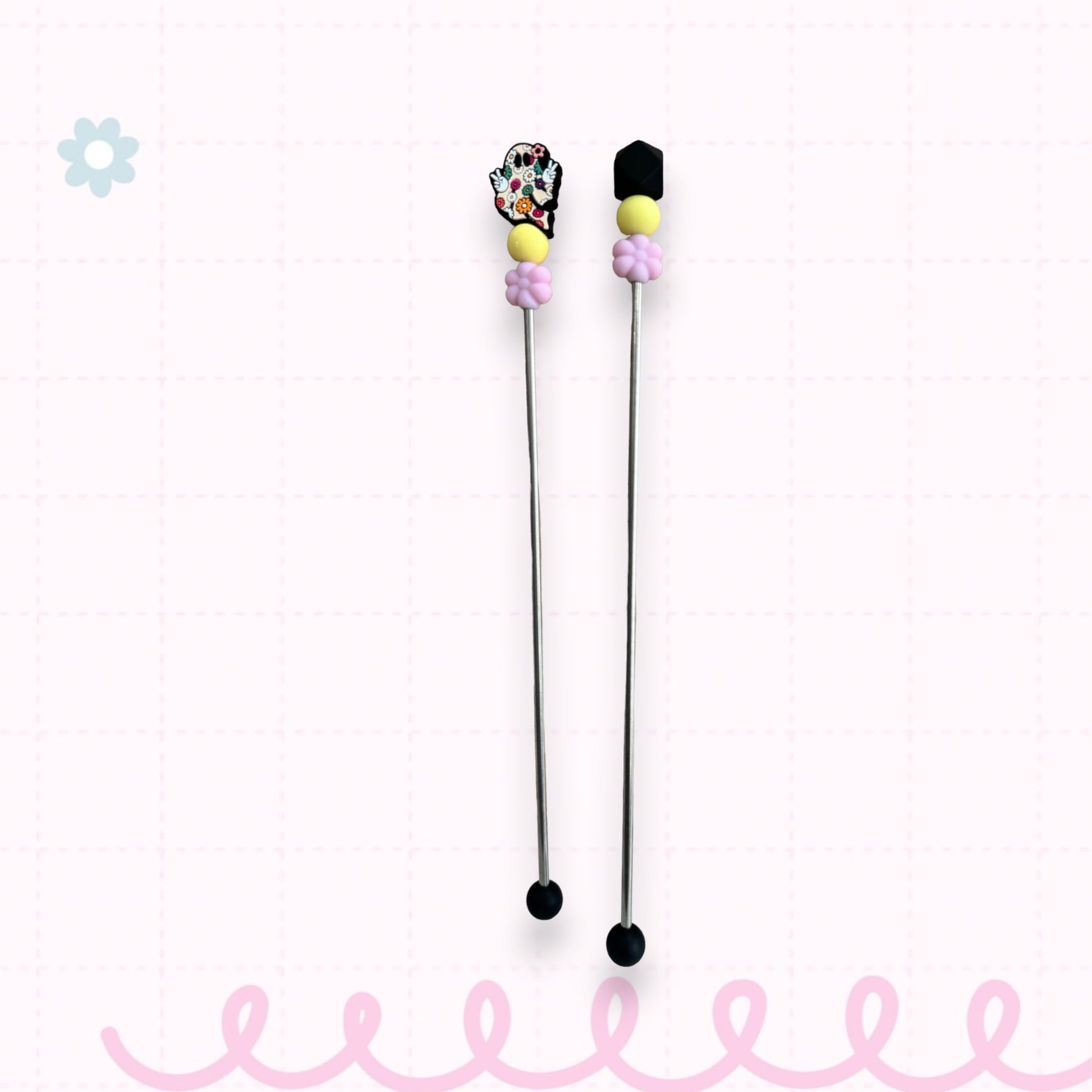 This AmiStix™️ set is made with as silicone topper.  The beads used vary with each one made and some may glow in the dark.  Your glow in the dark beads or solid color beads may not match the picture exactly and we do that on purpose to keep your set unique.  AmiStix™️ help hold your projects together while you sew them closed. They are 9 inches long with about 7 - 8 inches of working space. Each Stix comes with a reusable bag and safety tip.