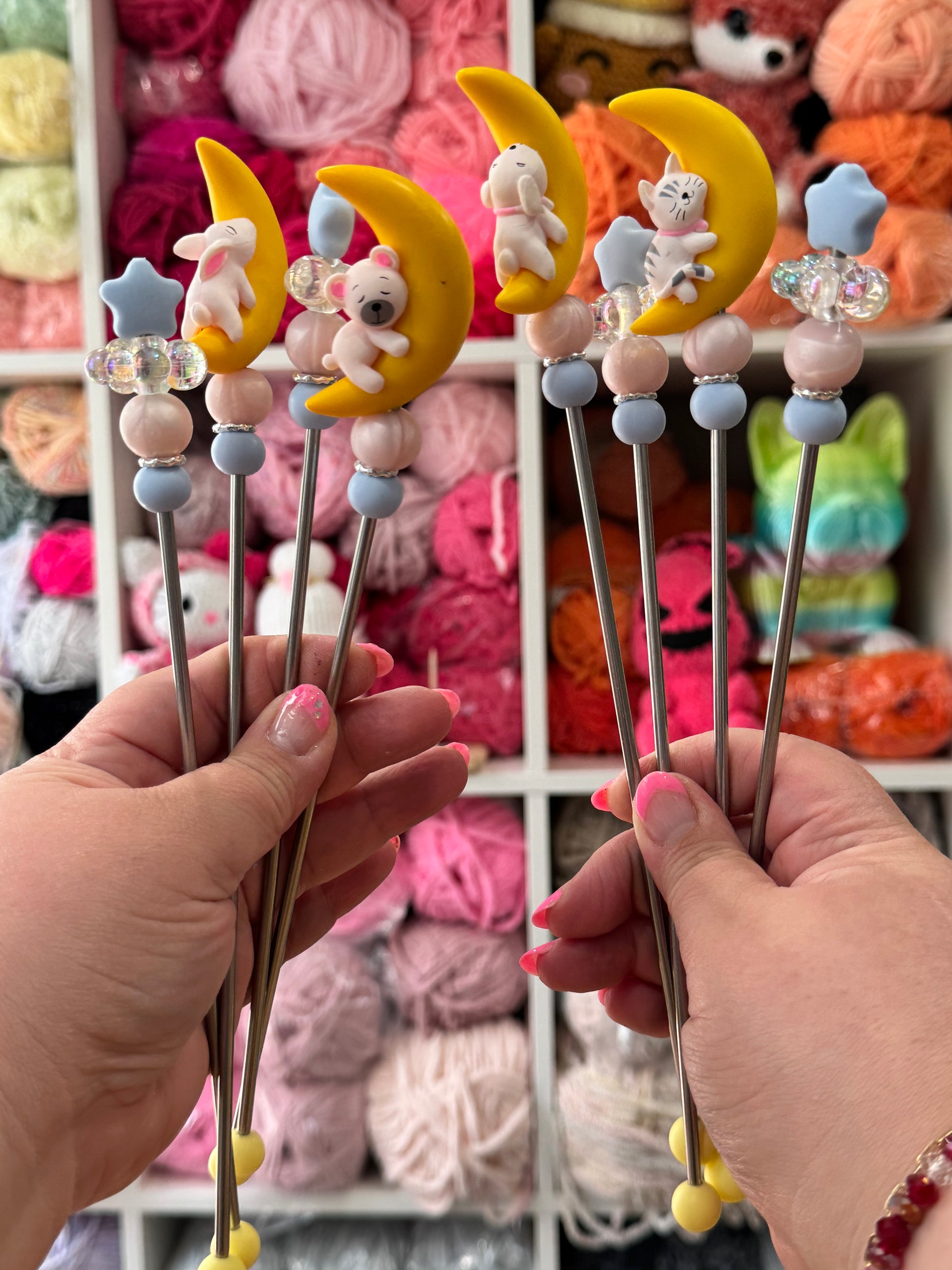 AmiStix™️ help hold your projects together while you sew them closed. They are 9 inches long with about 7 - 8 inches of working space. Each Stix comes with a reusable bag and tightening bead/safety tip.