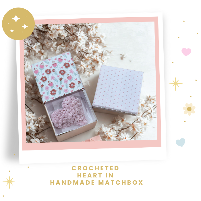 Each matchbox is individually crafted by hand and comes in a variety of colors and patterns—making every package a delightful surprise. The crocheted heart is small enough to carry and designed to be gently squeezed, offering a sense of calm and comfort whenever it’s needed most.