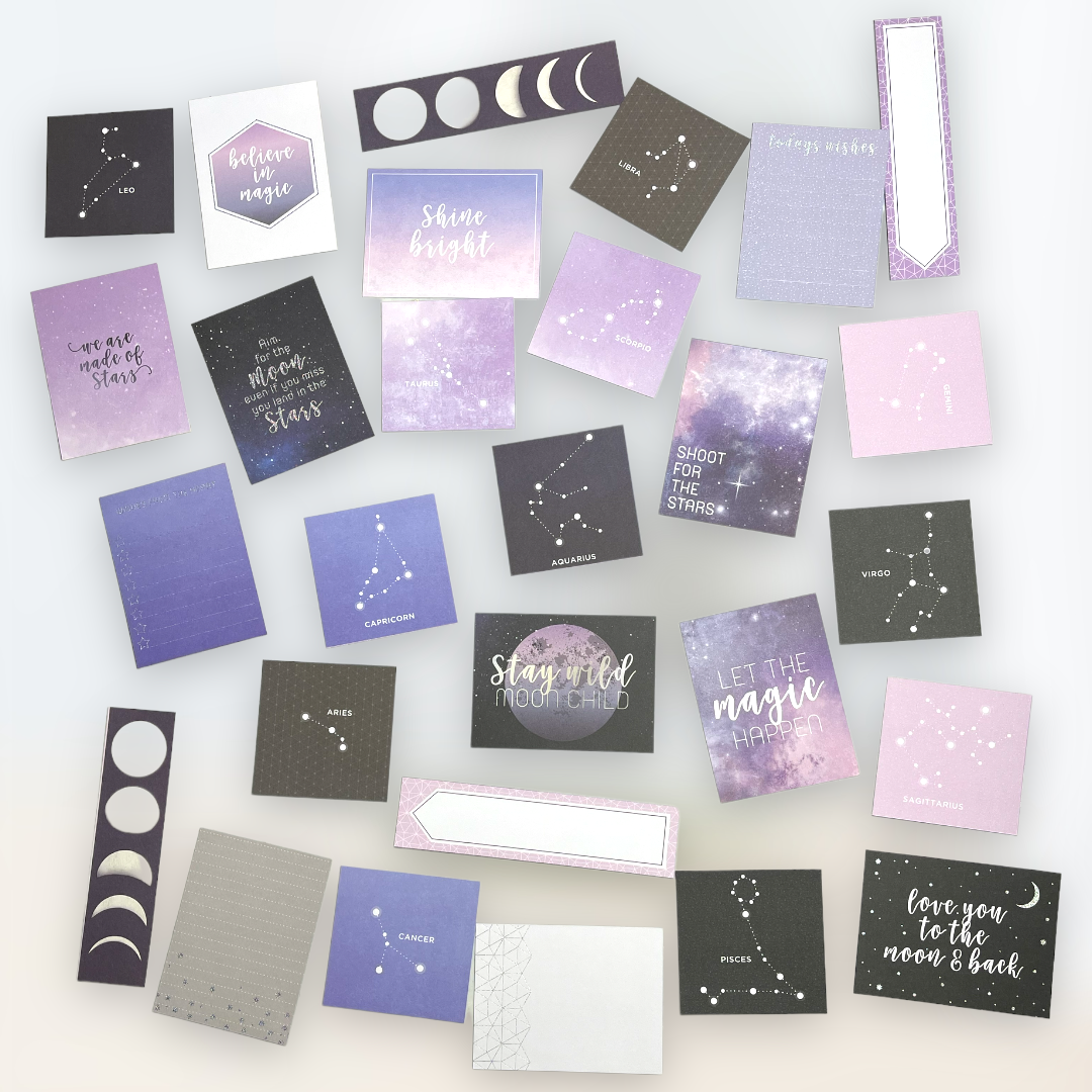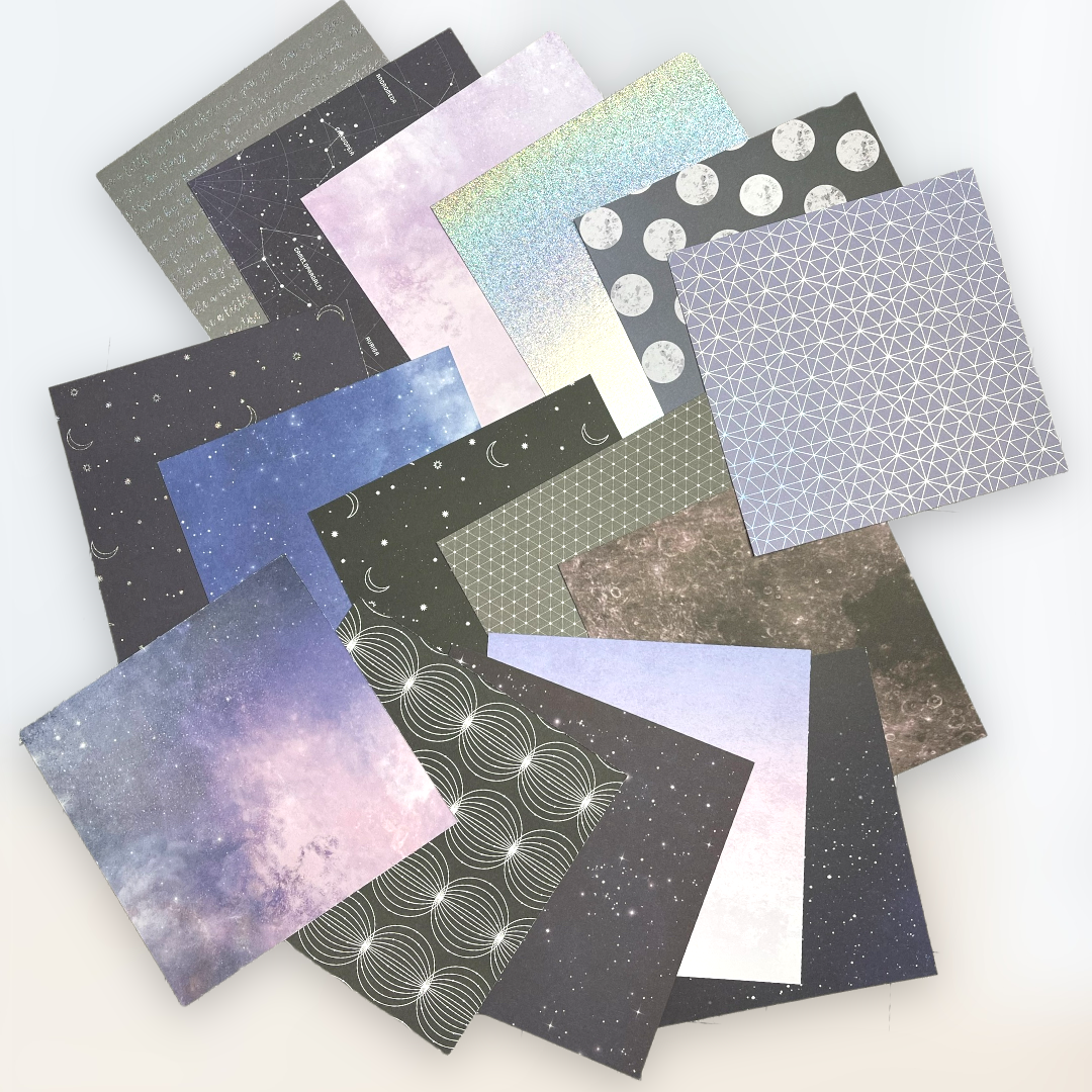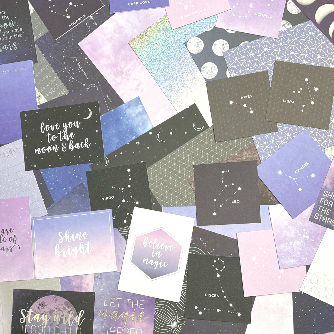 This cardstock is a zodiac galaxy theme. There are 40+ total pieces. You will get every pattern shown in the picture. The 16 6x6 pages are reversible so you will have 32 patterns. There is sun, moons, stars, galaxy’s and pattern pages.