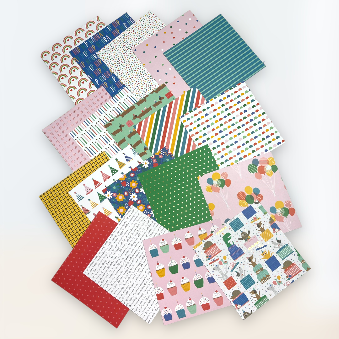This cardstock is a celebratory theme. Great for birthday card, graduations, or really just any reason to celebrate. There are 19 total pages included in this pack. You will get every pattern shown in the picture. There are no duplicates in this pack. There is rainbows, hearts which would be awesome for Valentine’s Day, sloths, dachshunds, cupcakes, floral, and sprinkle patterns.