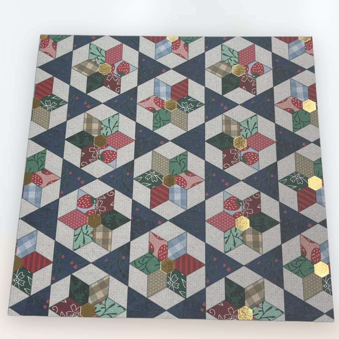 This pack includes 15 6 inch by 6 inch cardstock papers. The colors are warm hues of fall reds, blue, and browns,. There are strawberries, floral prints, and gold foil accents.