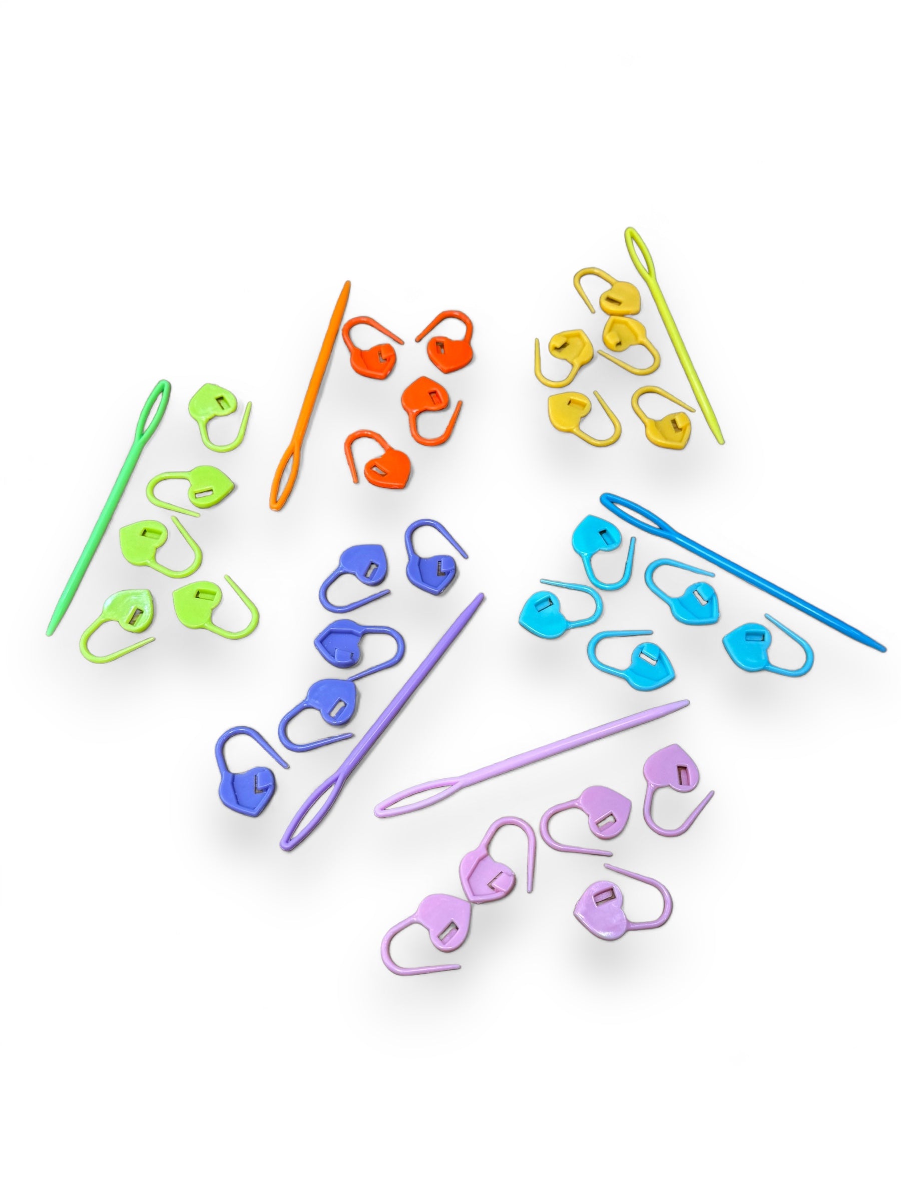You will receive 30 stitch markers. 5 of each color and 6 plastic needles, great for sewing with plush yarn.